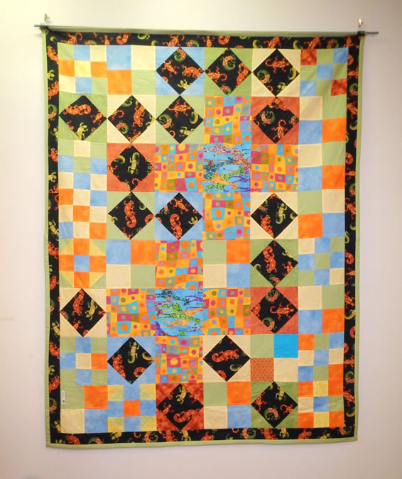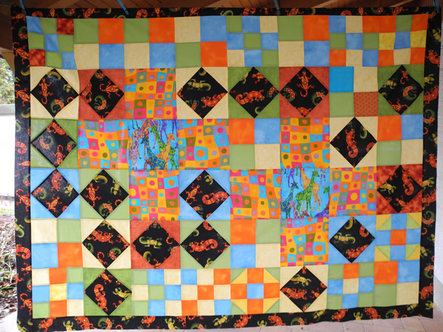 Den Stoff mit den Salamandern habe ich schon vor längerer Zeit gekauft, mit dem Ziel daraus für Anne einen Quilt zu entwerfen. Meine Schwiegertochter hat nämlich Agamen und begeistert sich für Reptilien. Mir fehlten jedoch lange Zeit die richtige Idee, Zeit und der entsprechende „Anschubser“ zum Beginnen. Im Dezember hat sie ihre Bachelor-Arbeit erfolgreich verteidigt. Das war jetzt ein willkommener Anlass Anfang Dezember loszulegen. Zur Verteidigung am 16. Dezember war dann der Top fertig, und heute habe ich den letzten von 18 Blöcken mit den Salamandern handgequiltet. Der Quilt leuchtet in Annes Lieblingsfarben blau, grün und gelb. Sie freut sich, dass sie nun auch einen eigenen Quilt besitzt.