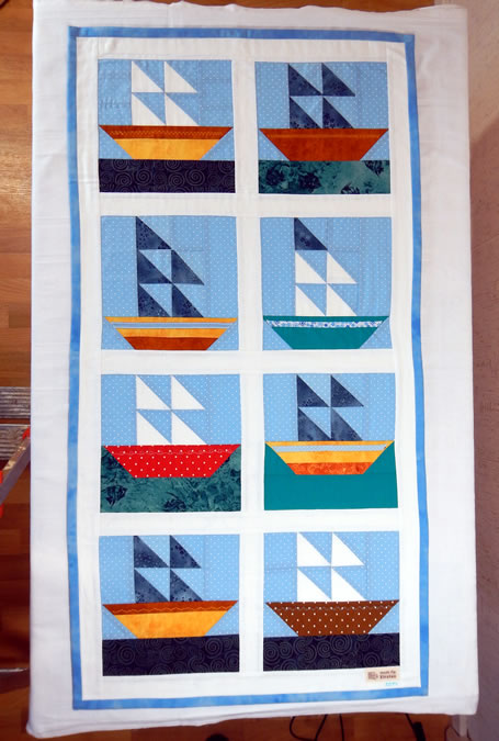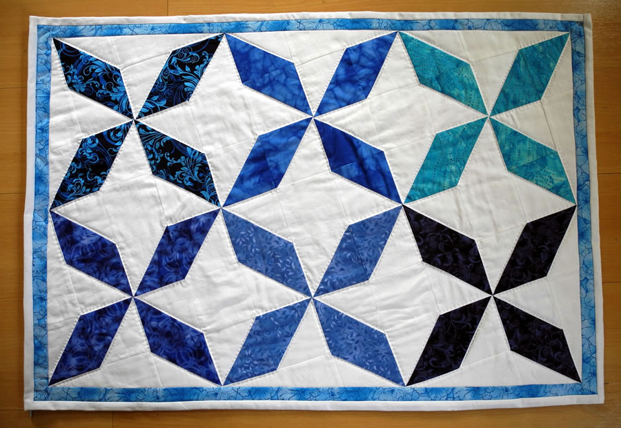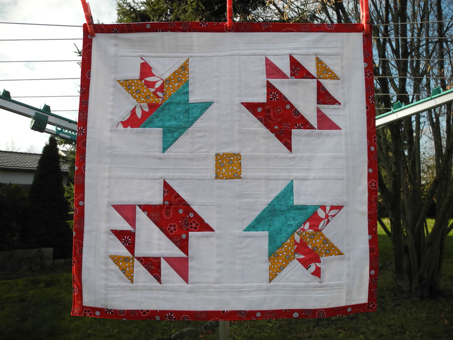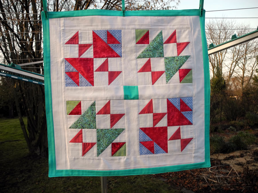 Ich liebe die Bewegung des Patchworkmusters Windmühlenflügel. Hier ist es aus „schnellen Dreiecken“ zusammengesetzt. Die blauen Stoffe habe ich letztes Jahr im Urlaub in Amsterdam bei „birdsblock“ gekauft. Der weiße Stoff war mal Damast-Bettwäsche. Er lässt sich wunderbar verarbeiten und sieht edel aus, da er glänzt nach dem Bügeln. Der Wandbehang ist handgequiltet.