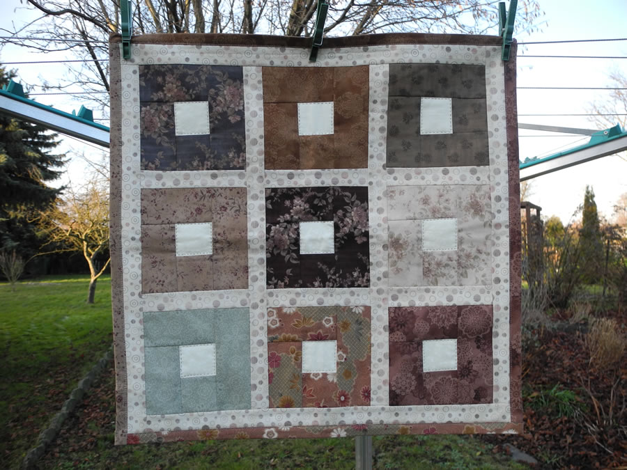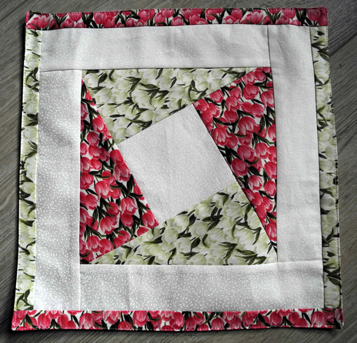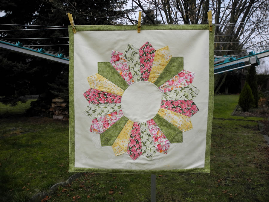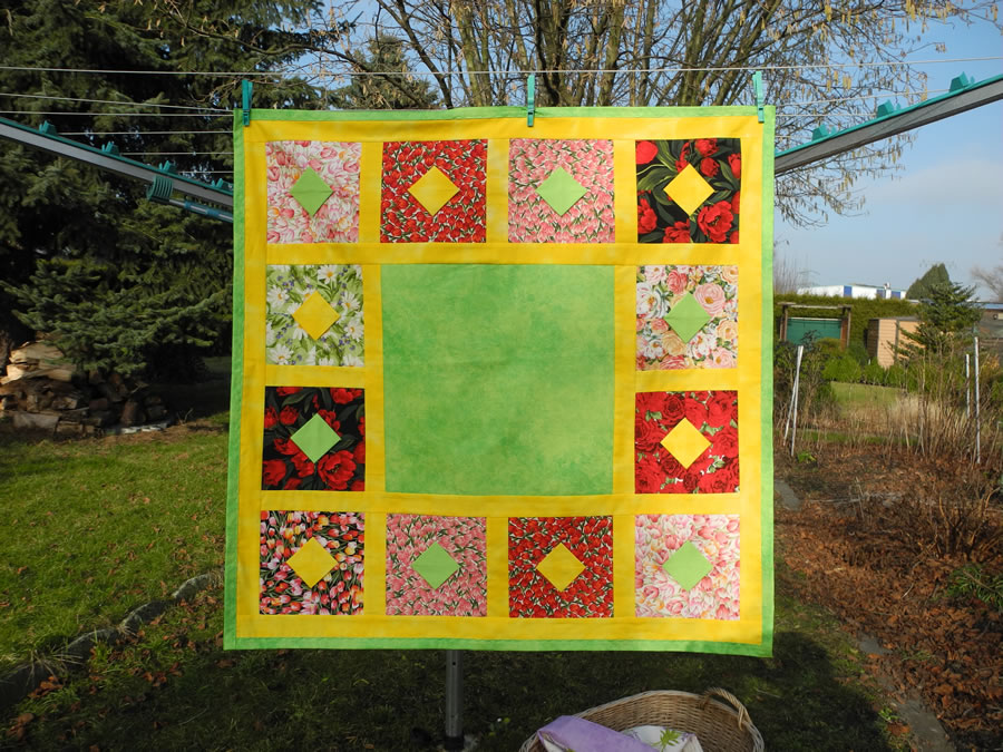 Für die kleinen Deckchen (ca. 30 x 30 cm) habe ich Tulpen oder anderen Blüten kombiniert mit zarten Frühlingsfarben wie Gelb, Rosa, Grün oder Orange. Die größere Decke (ca. 55 x 55 cm) besteht aus zwei 9er-Blöcken, die durchgeschnitten wurden um ein Quadrat angeordnet sind.