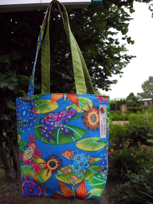 Diese Beutelchen sind für´s Frühstück gedacht. Den Stoff mit den wunderschönen goldenen Fischen und den Katzenstoff hat die Designerin Laurel Burch gestaltet, die leider nicht mehr lebt. Der Stoff mit den farbenfrohen Fröschen und Blumen ist einer meiner Lieblingsstoffe.