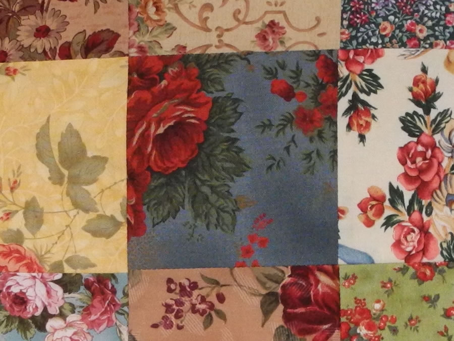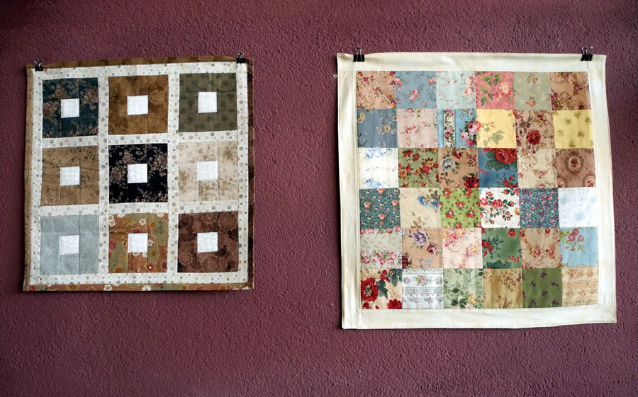 Diese Decken sind aus traditionellen Blöcken. Die rot-grüne Decke besteht aus Blöcken, mit den schönen Namen Blumenkorb bzw. Blütenkorb. Wasserrad, Windmühlensegel, Windmühlensegel-Quadrat und Schöne Welt heißen die Blöcke der Decke mit überwiegend Rot und Blau. „Old Maid´s Puzzle“ oder „Alt Jungfers Puzzel“ heißt der Block der Decke mit der grünen Einfassung.