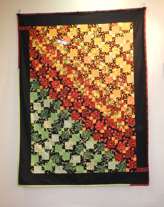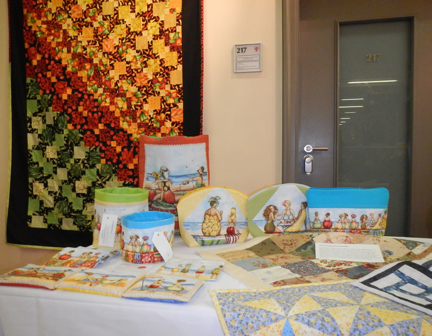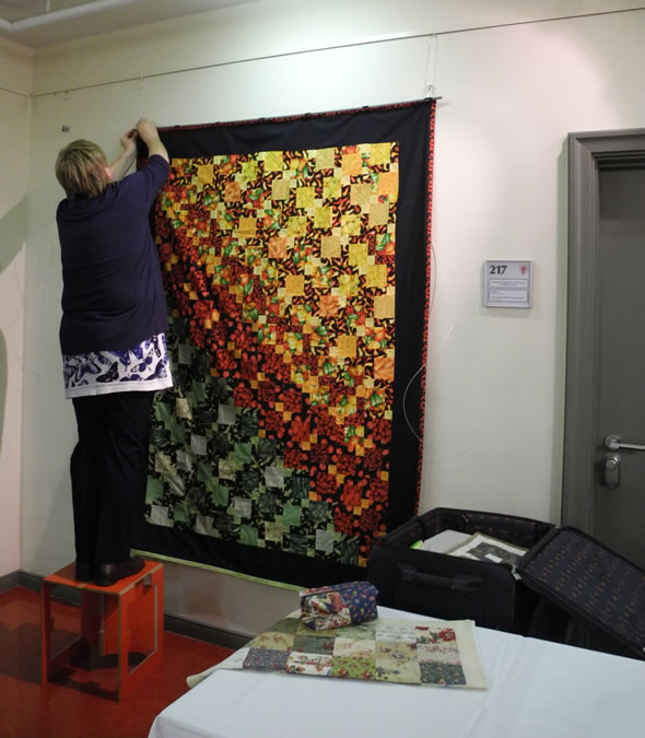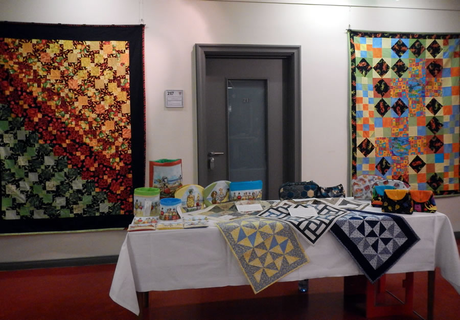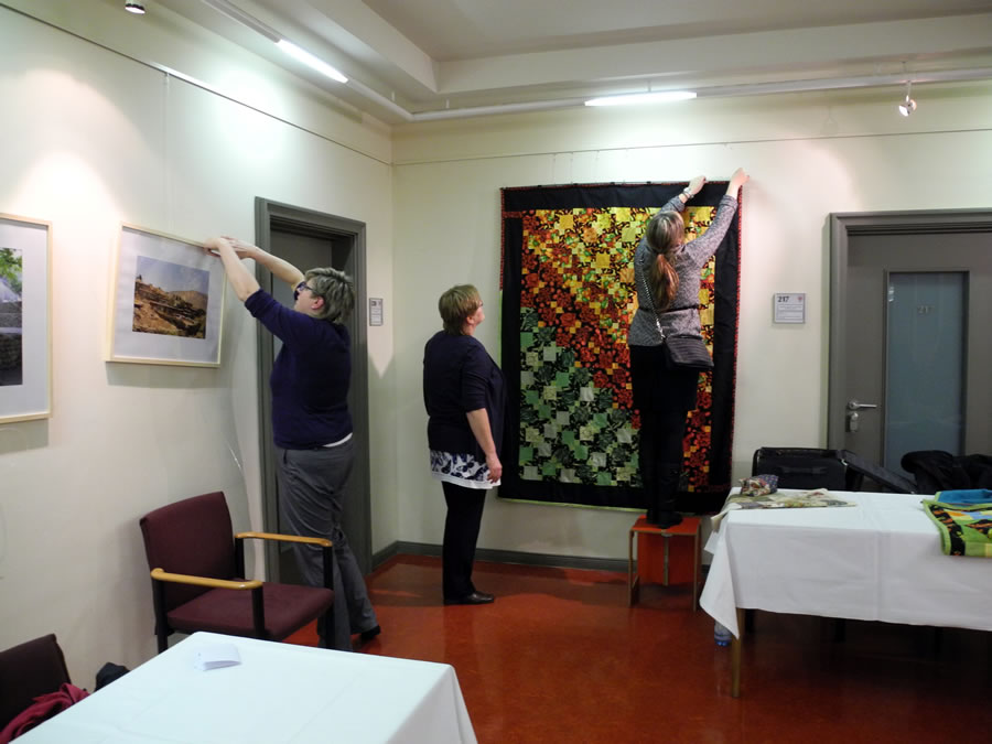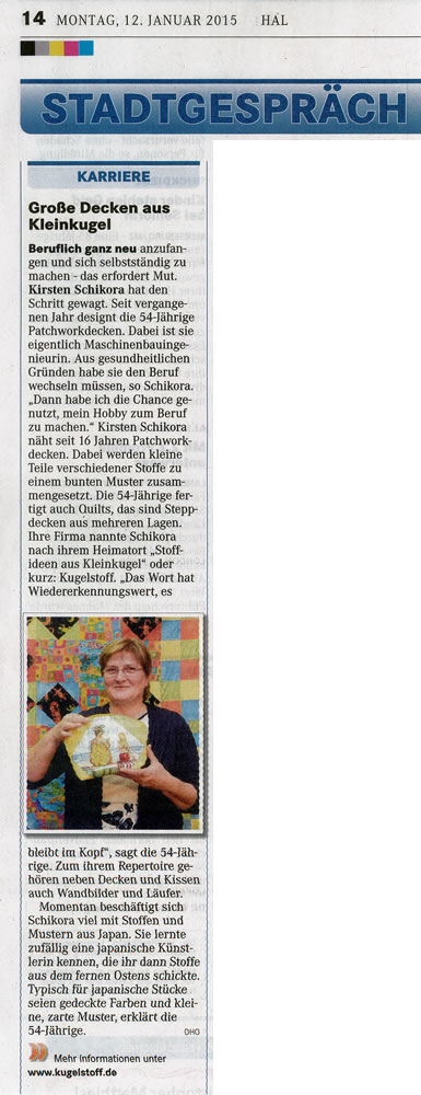 Für meine Ausstellung hatte ich drei Themen ausgewählt: Inspiration Japan, Badefrauen und Katzenmotive. Außerdem zwei farbenfrohe Quilts: der „Anne-Quilt“ entstand im Dezember 2014 und der „Gemüsestoffe-Quilt“ im November/Dezember 2014. Trotz des stürmischen Wetters waren sehr viele Besucher neugierig auf die „Nacht der Jungen Kunst“. So hatten wir ausgiebig Gelegenheit unsere Arbeiten vorzustellen. Ich hatte viele anregende Gespräche mit interessierten Besuchern und habe dabei auch gleich für meinen nächsten, im März beginnenden, Kurs in der Volkshochschule Halle geworben. Auch die „Mitteldeutsche Zeitung“ fand meine farbenfrohen Arbeiten offensichtlich interessant und hat darüber berichtet.