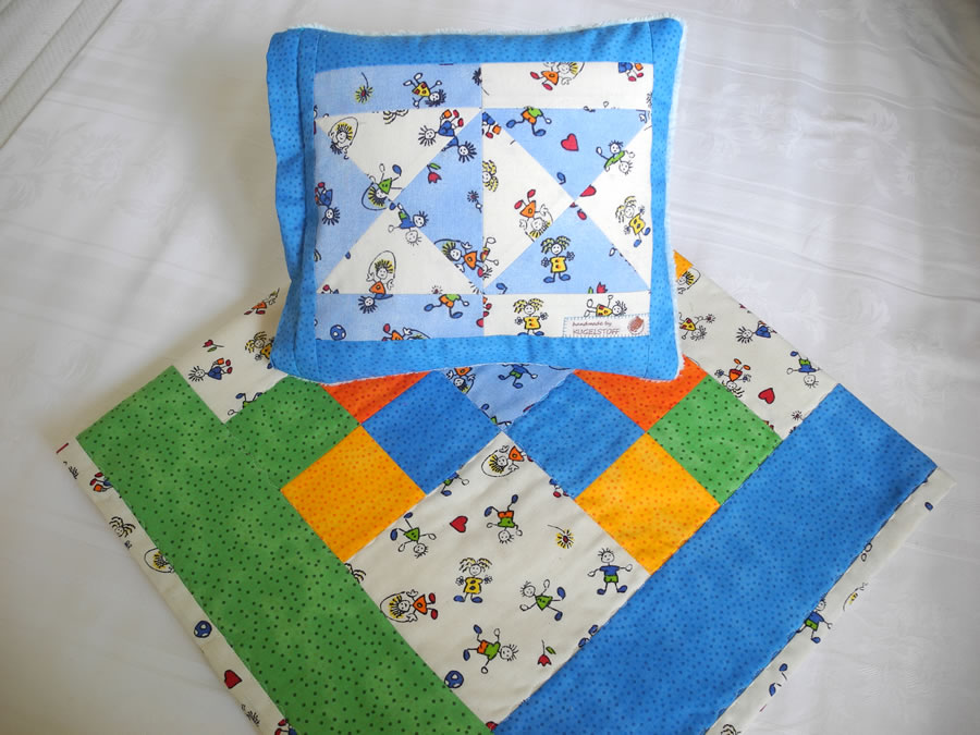 Jetzt habe ich diese Babydecke und das dazu passende Kuschelkissen „Strichmännlein“ in meinem Atelier fertig gestellt. Die Babydecke hat eine kuschelige Fleece-Rückseite. Das Kissen hat einen Reißverschluss, damit man die Hülle auch mal ohne Probleme waschen kann.