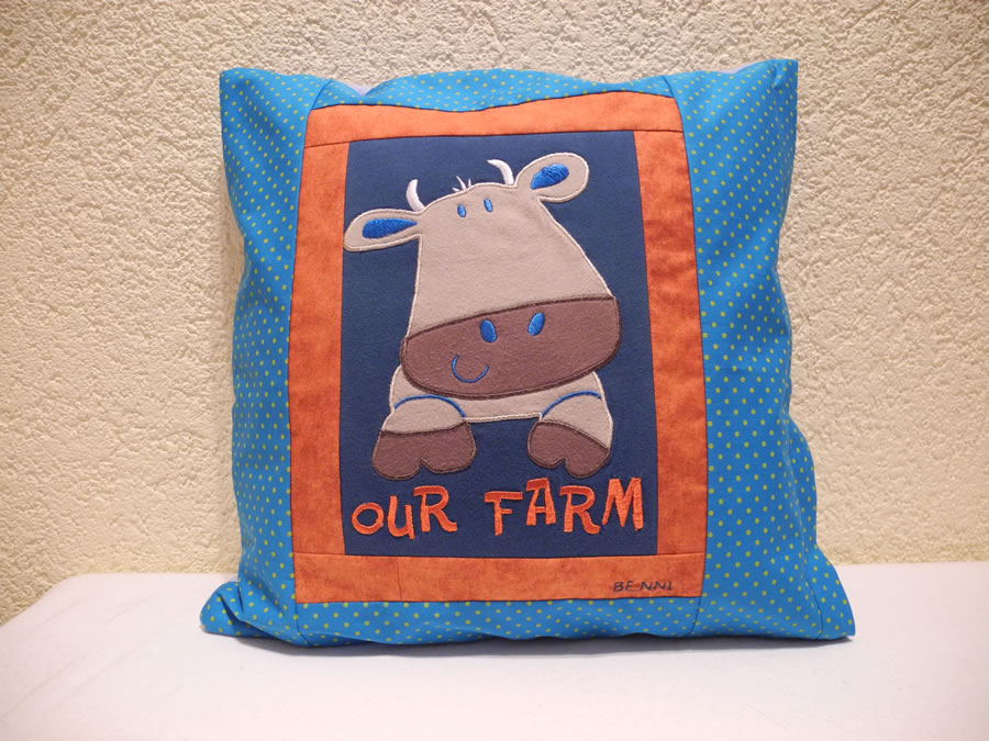 Der kleine Benni ist aus dem Babystrampler mit der lustigen Kuh lange herausgewachsen. Da hatte seine Mutti die Idee, daraus ein Kuschelkissen von mir nähen zu lassen. Und so sieht es nun aus. Die Rückseite ist aus Kuschelfleece und hat auch einen Kuhschwanz. Der Nikolaus hat es dann abgegeben.