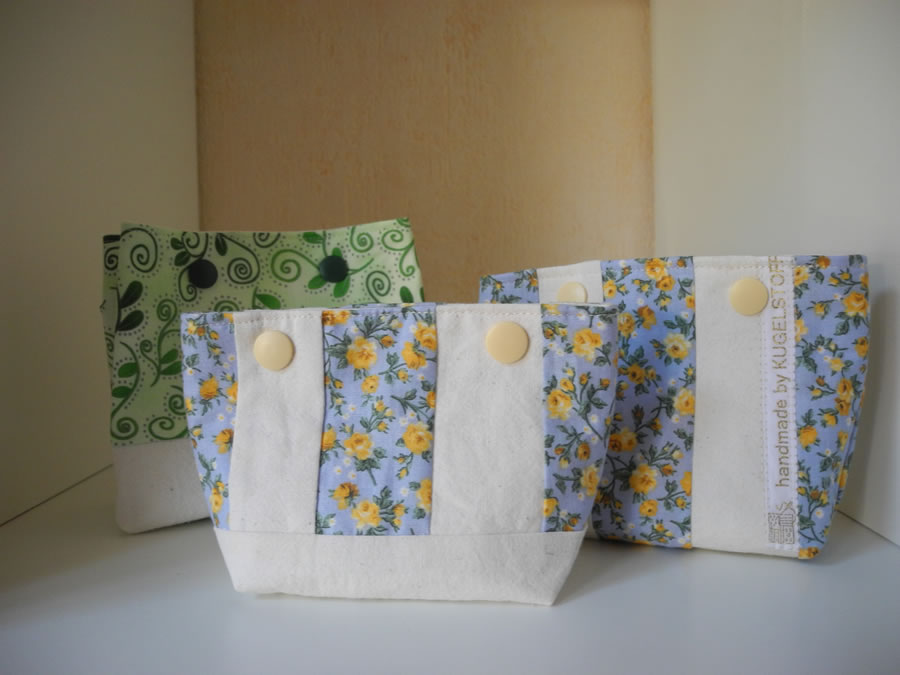 Diese kleinen Täschchen nach Patchwork-Manier und mit Druckknöpfen als Verschluss sind neu in meinem kleinen Atelier entstanden. Das Kombinieren und Zusammenstellen der unterschiedlichen Farben und Muster macht mir riesigen Spaß. Für jeden Geschmack findet sich dann das passende Täschchen.