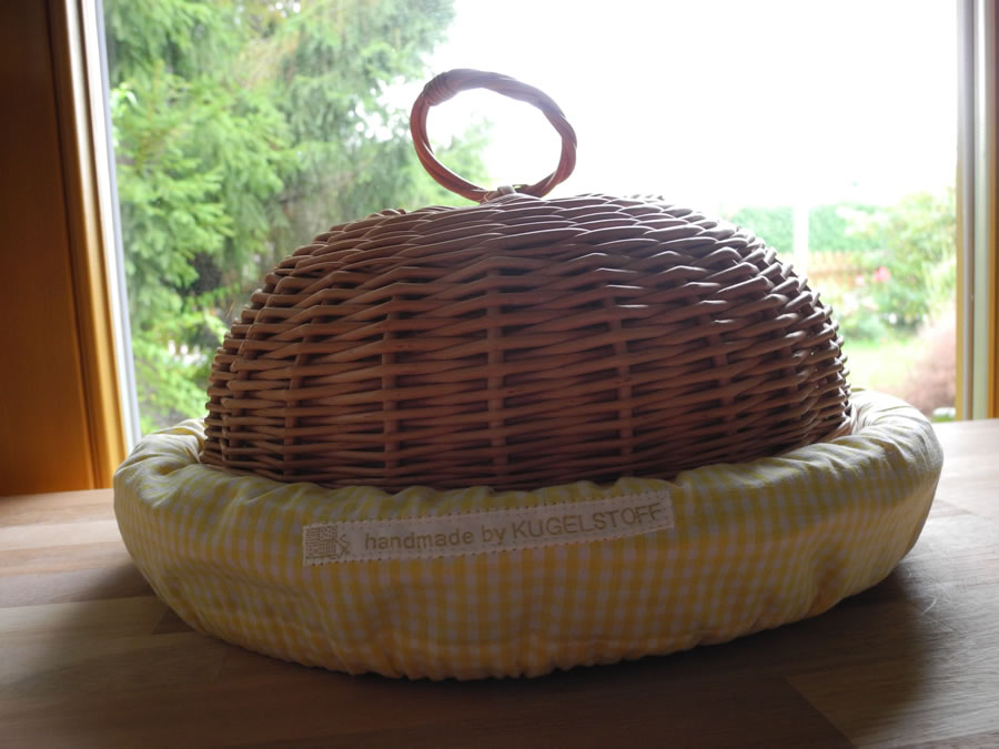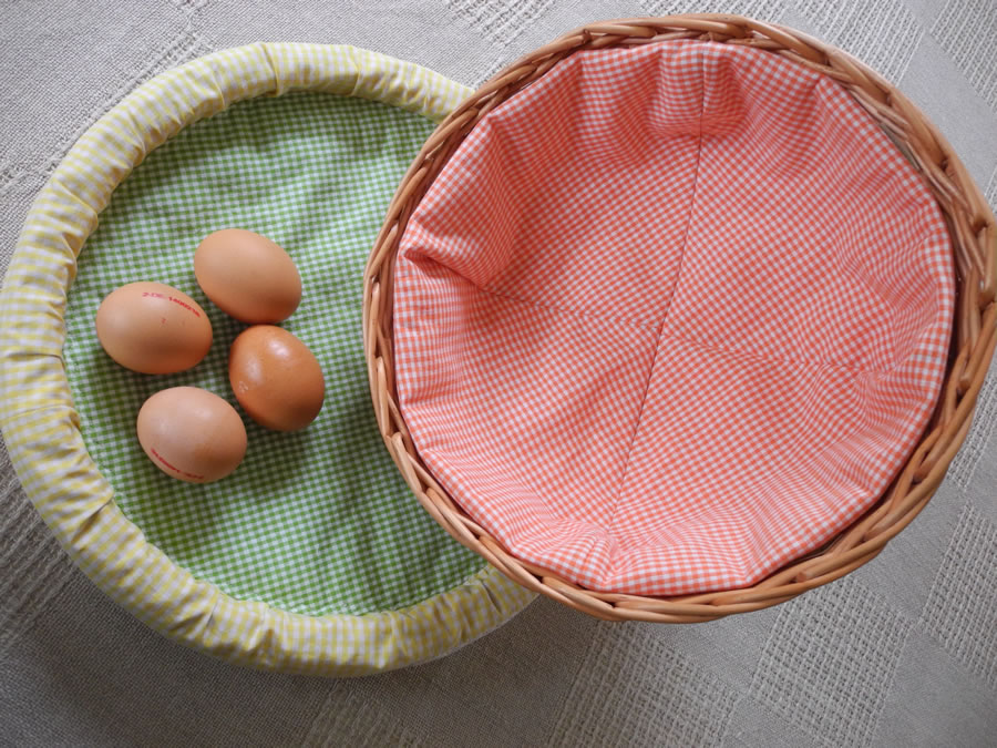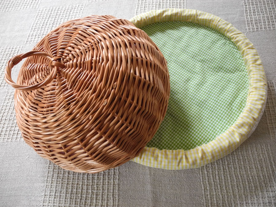 Damit die Eier auf dem Frühstücks-Buffet auch lange warm gehalten werden können, habe ich den Korb mit verschiedenen karierten Stoffen gefüttert. Der Boden und die Innenfütterung des Deckels haben noch eine zusätzliche, wärmende Vliesschicht erhalten. Die Konstruktion der Innenhaube war eine Herausforderung, der ich mich mit Freude und meinem Wissen aus Konstrukteurs-Zeiten gestellt habe