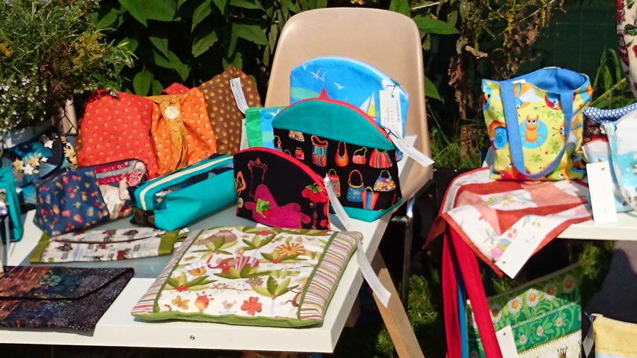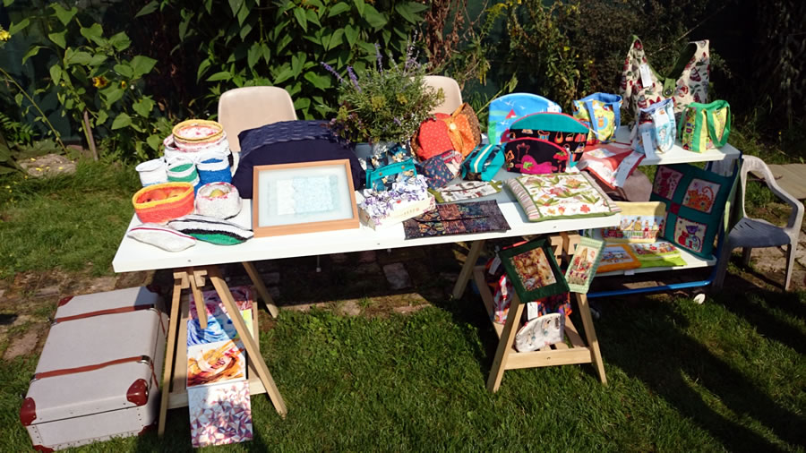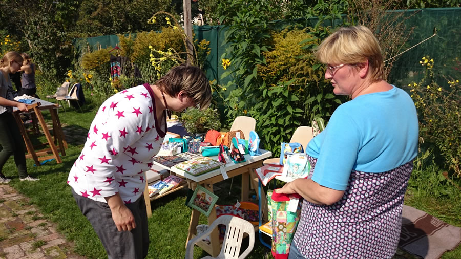 Heute waren Stefanie und ich auf dem Flohmarkt auf dem Gärtnereigelände des Blumenhauses Zeising in der Reilstraße in Halle. Stefanies Ketten, Gemälde und Upcycling-Objekte sind auf dem Gesamtbild links zu sehen.