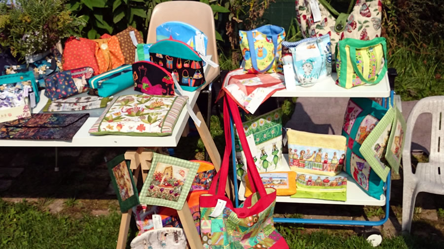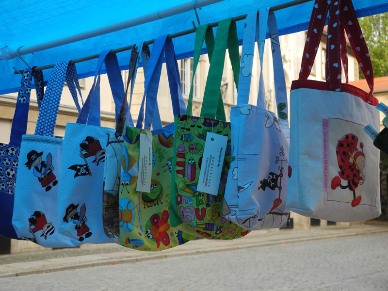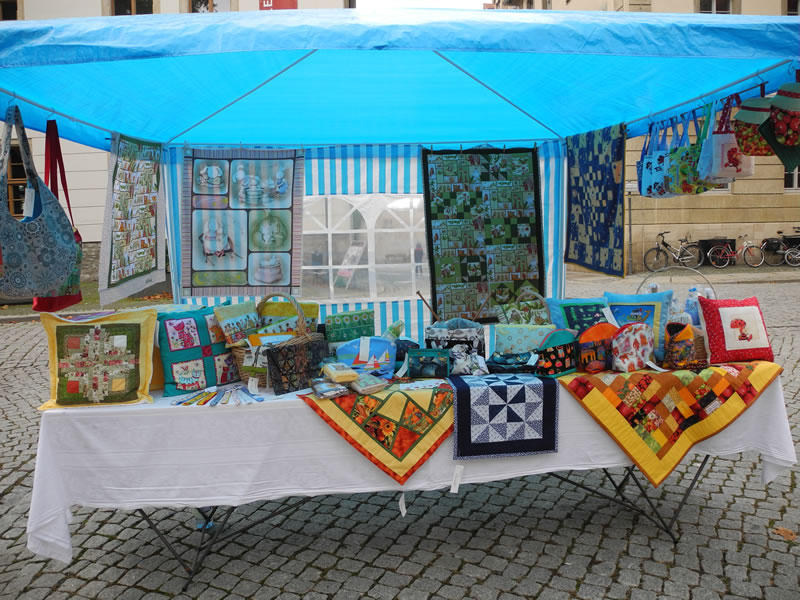 Während meines ersten Marktauftritts am 13. September hatte ich ein längeres und sehr angenehmes Gespräch mit der Fotografin Kathleen Brehme. Sie wies mich darauf hin, daß mein spontan gekaufter Pavillon mit dem blauen Dach nicht so optimal ist. Die Stoffe und natürlich auch die Fotos davon bekommen einen Blaustich. Stimmt. Wieder etwas gelernt.