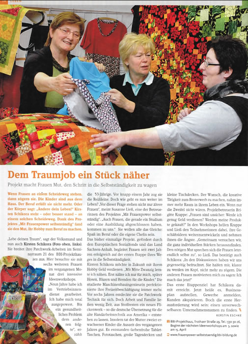 Im März diesen Jahres habe ich mich zum BBI Halle aufgemacht, um an dem Projekt „Mit Frauenpower selbstständig“ teilzunehmen. Für mich war die Frage zu klären, kann ich mit meinem langjährigen Hobby eine kleine Selbstständigkeit aufbauen und wie stelle ich es an damit auch Geld zu verdienen. Dort traf ich auf Gleichgesinnte, mit denen ich gemeinsam mit den beiden Projektbetreuerinnen Susanne Liess und Brigitte Krappe nach Möglichkeiten suchte. Aber am aller wichtigsten war für mich die Motivation und die Bestärkung, die ich durch diese Frauen erfahren habe.