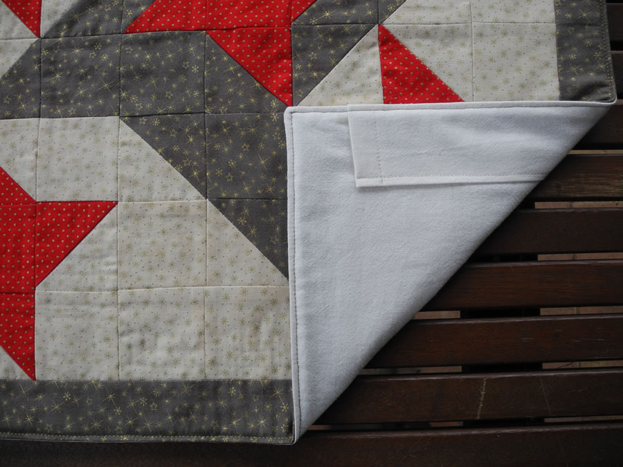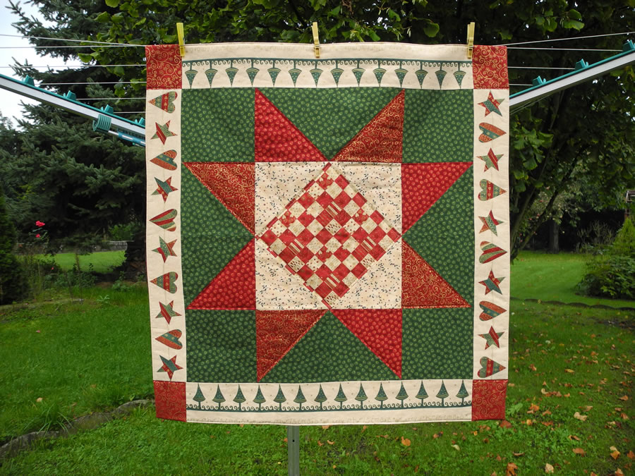 Als Anregung für meine „Patchworkfrauen“ im VHS-Kurs habe ich diese weihnachtliche Decke mit fünf leuchtend roten Sternen genäht. Mich hat das Motiv des großen Sternes im Hintergrund des roten Sternes besonders gereizt. Die Methode der „schnellen Dreiecke“ konnte bei dieser Arbeit ausgiebig angewendet werden.