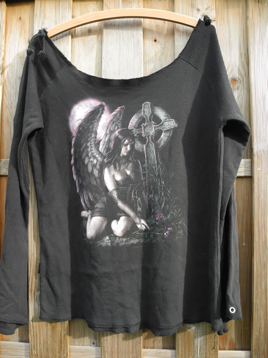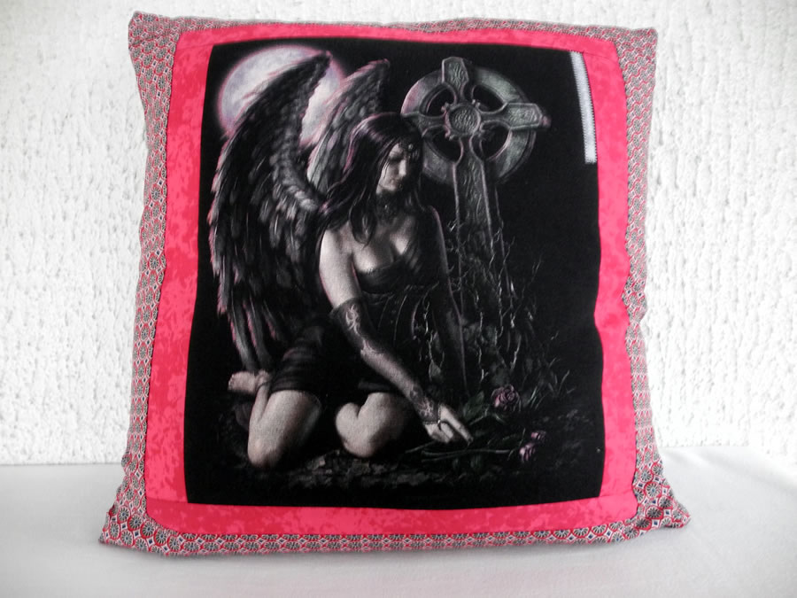 Alles hat seine Zeit. Das Shirt fand die Besitzerin in ihrer Sturm-und-Drang-Zeit als Grufti chic. Die ist jetzt vorbei und das Shirt wird nicht mehr angezogen. Aber das Bild mag sie immer noch, weil es an alte Zeiten erinnert. Da konnte ich doch mit meiner Idee - individuelle Kuschelkissen- helfen. Die zarten Pinktöne im Bild finden sich im schmalen Rahmen wieder sowie im grafischen Muster des äußeren Randes.