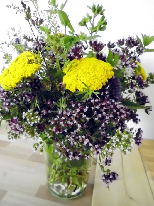 Diesen wunderschönen und duftenden Kräuterstrauß habe ich heute aus meinem Kräutergarten geholt. Er enthält: Anis-Ysop (Agastache anisata), Diptam (Dictamus albus), Goldgarbe (Achilea sp.), Chinesischer Schnittlauch (Allium tuberosum), Pfefferminze (Mentha mentha), Estragon (Artemisia dracunculus), Dost/Wilder Majoran (Origanum vulgare), Majoran winterfest (Origanum x majoricum) und Zitronenmelisse (Melissa officinalis)