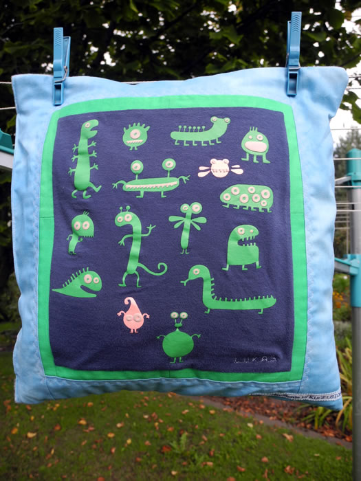 Jede Menge kleine, lustige und niedliche Monster finden sich auf diesen Kissen. Den Stoff habe ich im Schaufenster von „Vollstoff“ in Halle gesehen und war gleich begeistert.