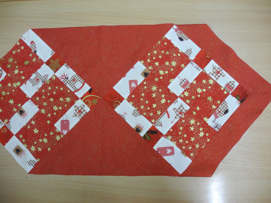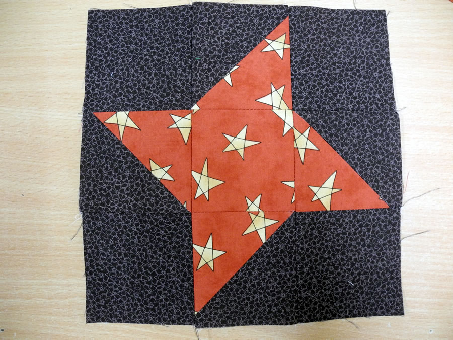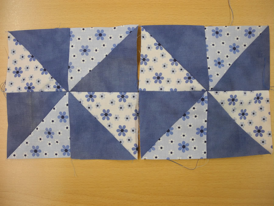 Nun ist der Schnupperkurs „Patchwork“ an der VHS Halle (Saale) schon vorbei. Die Frauen haben aus dem gedrehten 9-er Block ganz unterschiedliche Muster gestaltet. Es entstanden kleine Decken oder ein Läufer mit 2 Blöcken auf die Spitze gestellt. Auch in einer Puppenwagendecke kommt nun der Block schön zu Geltung. Alle waren stolz auf Ihre ersten Patchworkarbeiten. So haben wir uns am 3. Abend auf allgemeinen Wunsch an die Methode der „schnellen Dreiecke“ gewagt und daraus 4-zackige Sterne oder Windmühlen genäht.