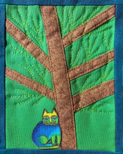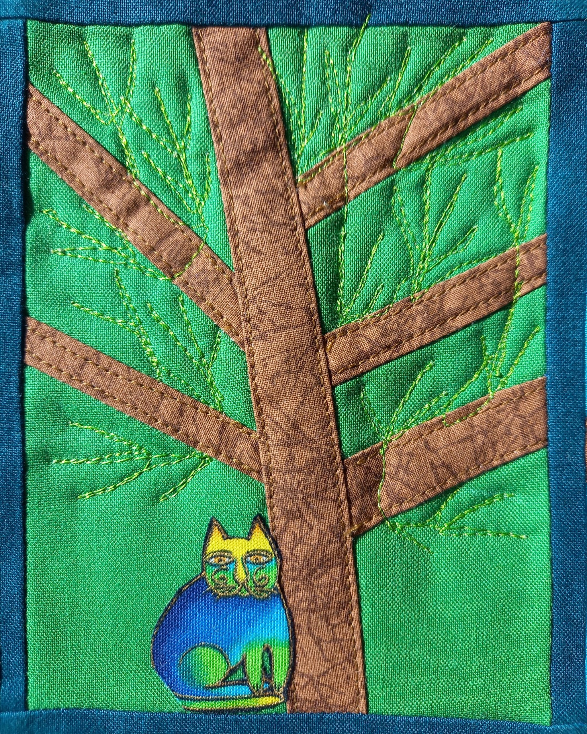 Letztendlich habe ich mich doch ab das freie Maschinensticken, und das frische Frühlingsgrün der Bäume mit dem neuerworbenen Garn gestickt. Das Garn leuchtet schön und gefällt mir sehr. Die Katzen setzten das I-tüffelchen im Bild, nur die Bäume wäre mir zu langweilig, außerdem nehmen sie dem Ganzen den Ernst, bringen einwenig Spaß ins Spiel.